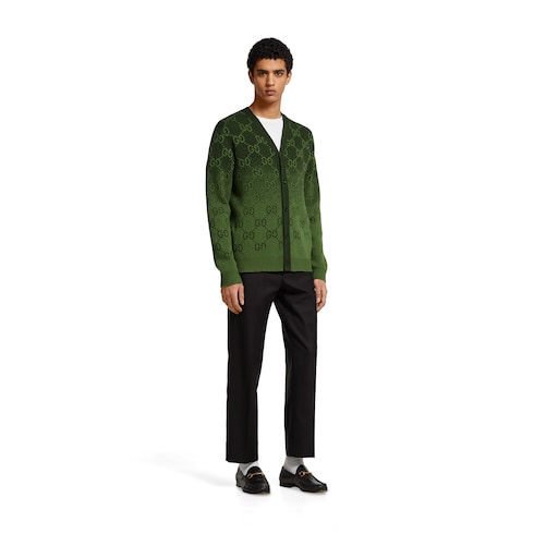 Le dégradé de couleurs est réalisé avec soin pour mettre en valeur la texture des matériaux et le motif GG emblématique. Ce cardigan s’affiche en jacquard de laine GG dégradé du vert forêt au vert.