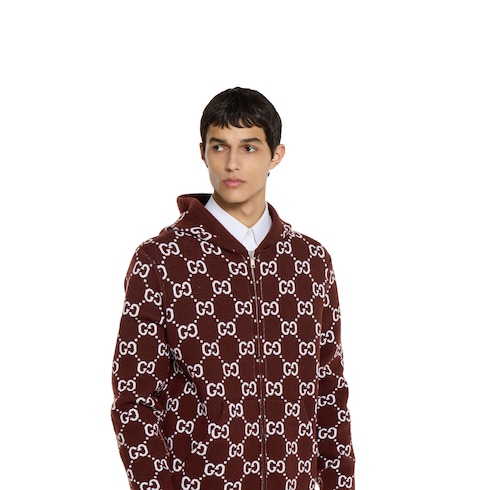 Pour la collection Pre-Fall 2025, les essentiels de la garde-robe urbaine pour l’extérieur, tels que les blousons aviateur et les vestes en cuir, associent raffinement et matières somptueuses avec une petite touche d’élégance. Confectionnée en maille de laine bordeaux, cette veste zippée présente un envers en jacquard de laine GG, agrémenté d’un détail bande Web.