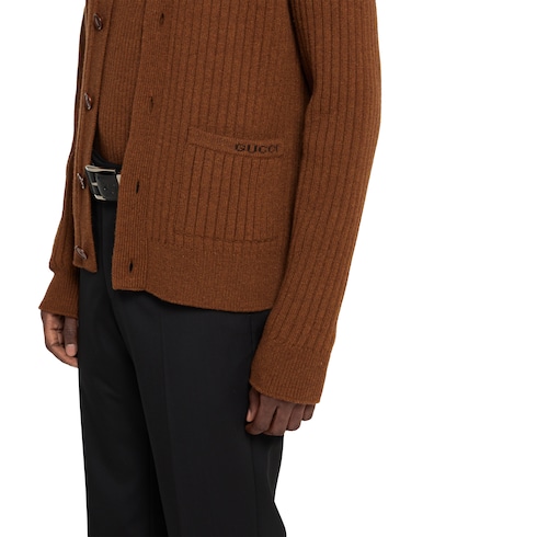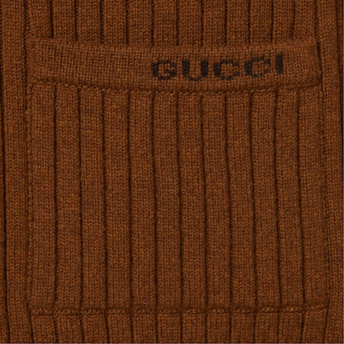La collection Pre-Fall 2025 met en avant des silhouettes incontournables avec des détails emblématiques, pour la journée comme la soirée. Ce cardigan en maille de laine et cachemire côtelée marron est orné d’un motif Gucci en intarsia.