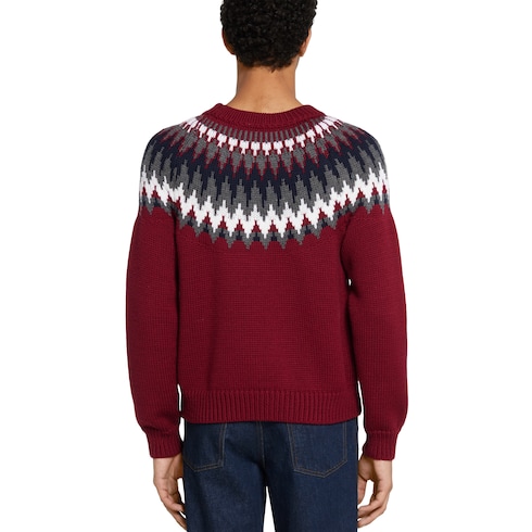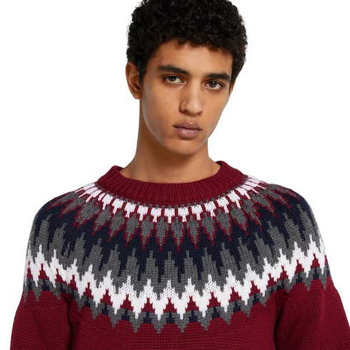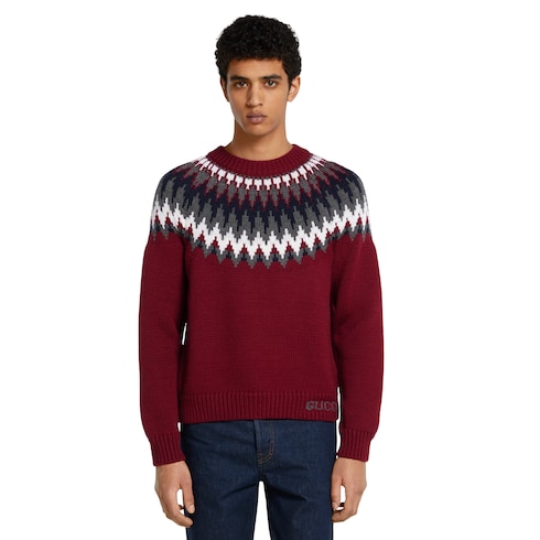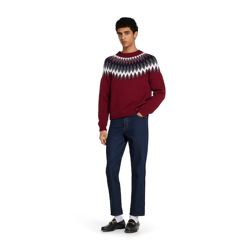 Des teintes automnales et des détails emblématiques de la Maison caractérisent une sélection de pièces habillées. C’est l’alliance parfaite entre élégance intemporelle et allure moderne, avec une attention particulière portée à la précision des lignes et à la décontraction des coupes. Confectionné en maille de laine épaisse rouge Gucci Rosso Ancora ce pull est orné d’un intarsia Gucci.