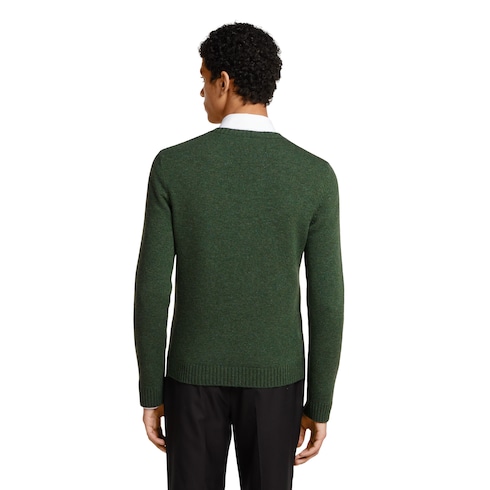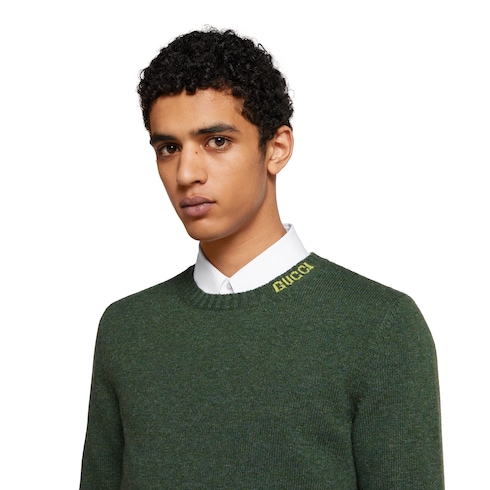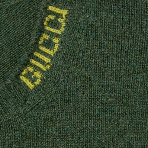 La collection Pre-Fall 2025 met en avant des silhouettes incontournables avec des détails emblématiques, pour la journée comme la soirée. Ce pull en maille de laine feutrée vert foncé se caractérise par un motif Gucci en intarsia.