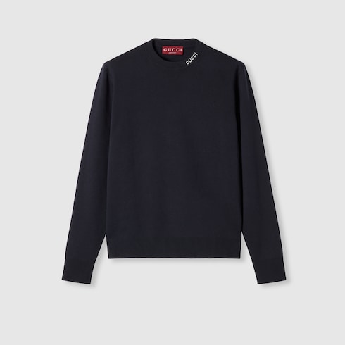 La collection Pre-Fall 2025 met en avant des silhouettes incontournables avec des détails emblématiques, pour la journée comme la soirée. Ce pull en maille de soie et coton bleu marine se caractérise par un motif Gucci en intarsia.