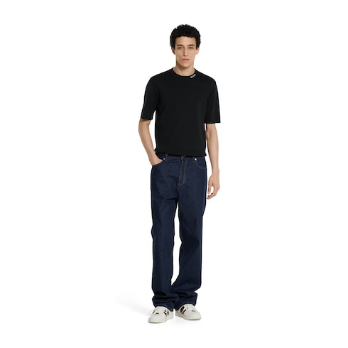 La collection Pre-Fall 2025 met en avant des silhouettes incontournables avec des détails emblématiques, pour la journée comme la soirée. Ce t-shirt en maille de soie et coton noire est orné d’un motif Gucci en intarsia.