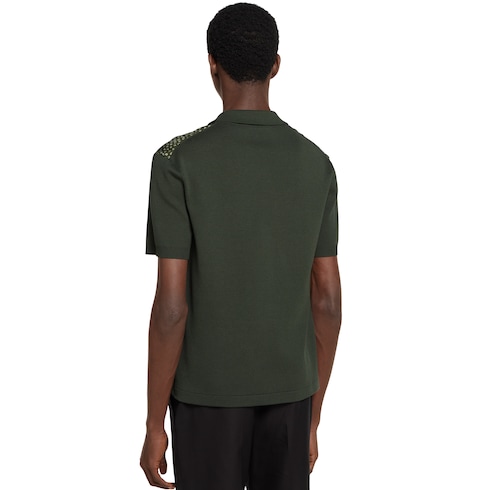 Dans la collection Pre-Fall 2025, une sélection de pièces de prêt-à-porter se caractérise par un esprit bohème coloré et des silhouettes décontractées. Confectionné en maille de soie et coton vert forêt, ce polo est orné d’un imprimé bandana sur toute la surface.