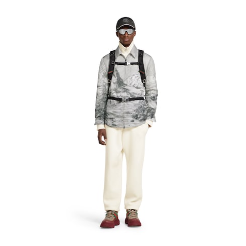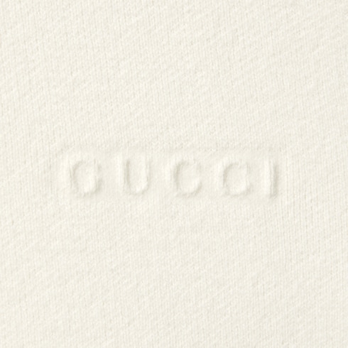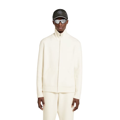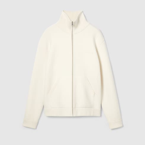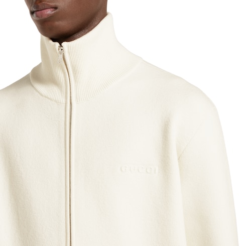 La collection associe des textures douces à des détails sophistiqués pour donner une touche raffinée à la garde-robe d’hiver. Confectionnée en maille en piqué de laine et cachemire blanc, cette veste zippée se caractérise par un logo Gucci embossé.