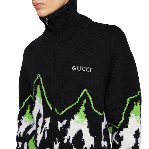 Des matières douces et texturées composent une garde-robe hivernale aussi élégante en ville que fonctionnelle en montagne. Confectionnée en jacquard de laine épaisse coloris multicolore et noir, cette veste zippée se caractérise par un intarsia avec motif montagnes.