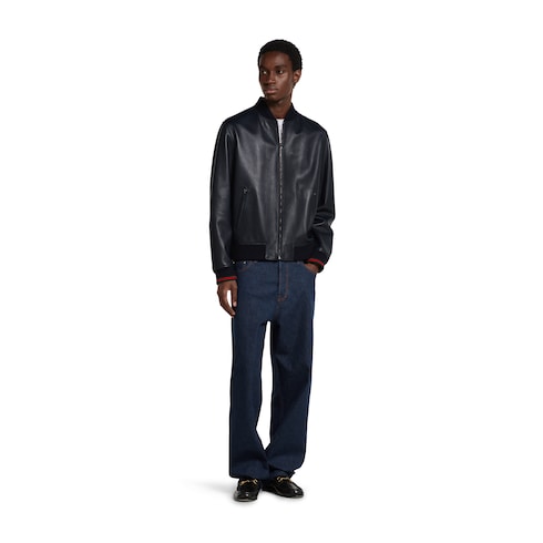 Pour la collection Pre-Fall 2025, les essentiels de la garde-robe urbaine pour l’extérieur, tels que les blousons aviateur et les vestes en cuir, associent raffinement et matières somptueuses avec une petite touche d’élégance. Cette pièce en cuir nappa léger mat est rehaussée d’une finition à bande Web.