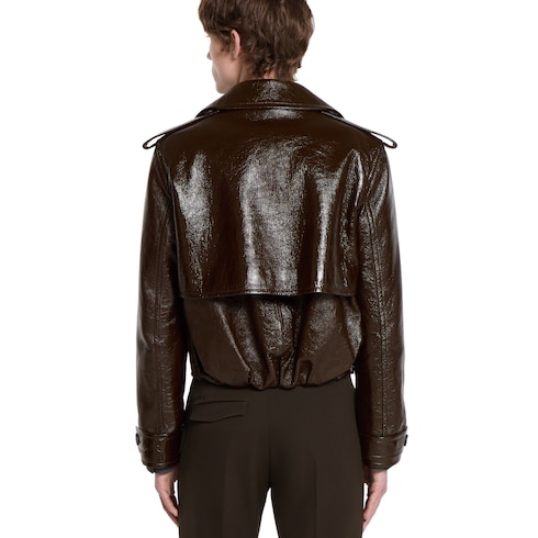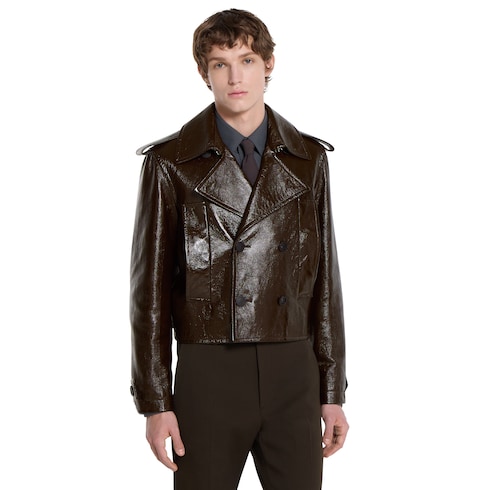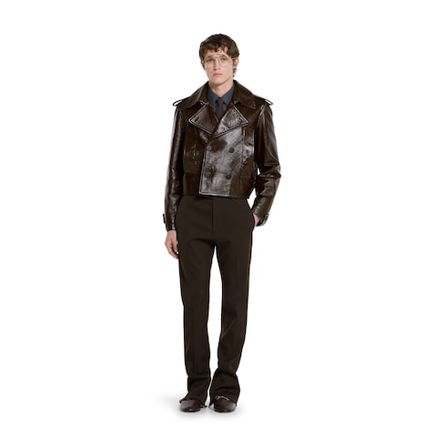 Pour la collection Automne-Hiver 2025, le cuir s’exprime dans toute sa richesse à travers une variété de traitements et de textures. Cette veste de motard réinterprète une silhouette intemporelle grâce à une conception raffinée et une fermeture par bouton.