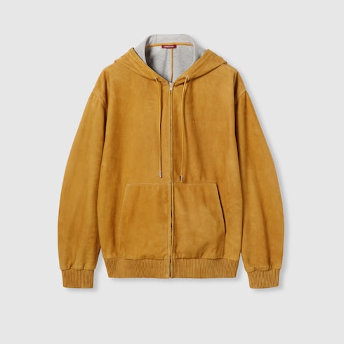 Idéales pour le bord de mer, les créations d’inspiration marine rehaussent les silhouettes décontractées de rayures, de motifs ancre et du logo de la Maison au sein de la collection Pre-Fall 2025. Ce sweat-shirt zippé est confectionné en daim léger camel contrecollé avec du jersey de coton. Un logo Gucci embossé complète ce modèle.