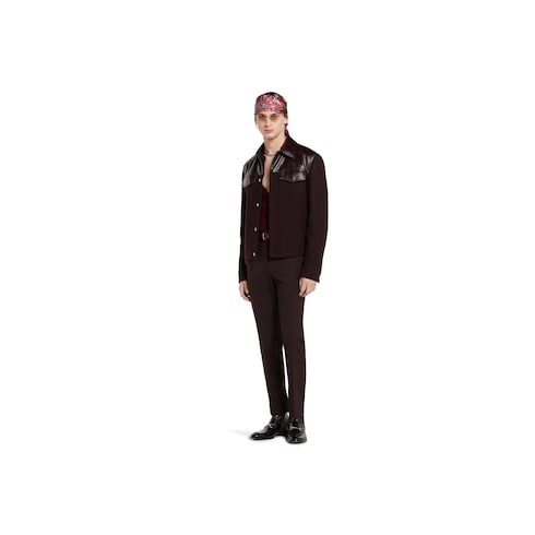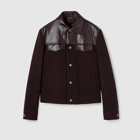Pour la collection Pre-Fall 2025, les essentiels de la garde-robe urbaine pour l’extérieur, tels que les blousons aviateur et les vestes en cuir, associent raffinement et matières somptueuses à une touche d’élégance. Confectionnée en laine batavia bordeaux foncé, cette veste est rehaussée de finitions en cuir et de boutons métallisés Gucci signature.