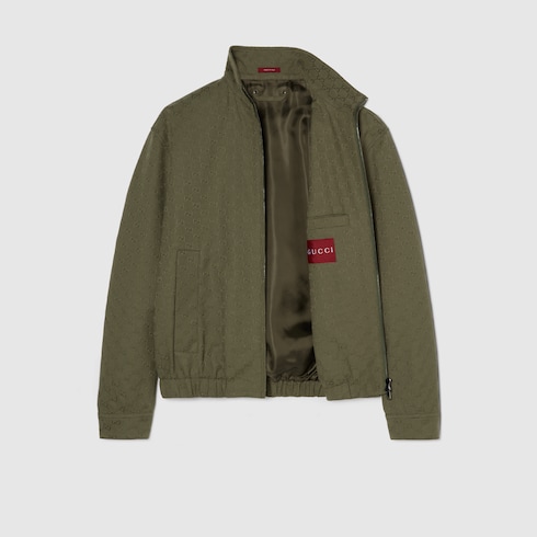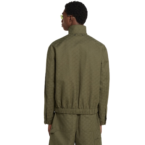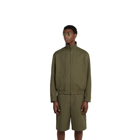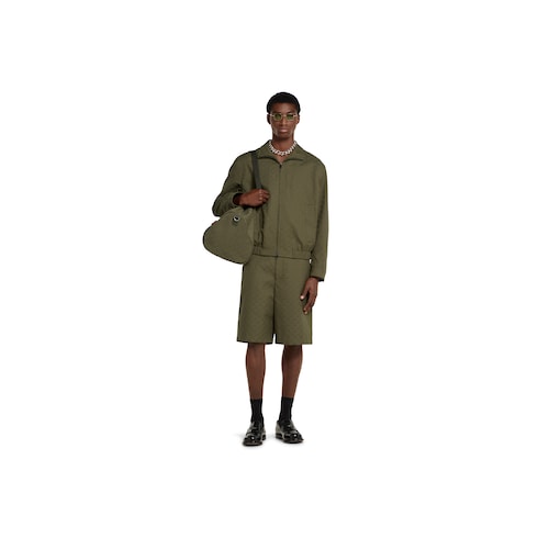 Pre-Fall 2025 pieces in muted black, grey and green tones spotlight delicate floral embroideries, embossed logos, and more craftsmanship details. Crafted from forest green canvas, this bomber jacket is defined by the signature GG monogram.
