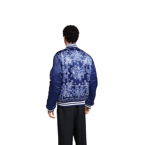 Dans la collection Pre-Fall 2025, une sélection de pièces de prêt-à-porter se caractérise par un esprit bohème coloré et des silhouettes décontractées. Cette veste zippée en satin bleu se caractérise par un imprimé bandana fleuri sur toute la surface.