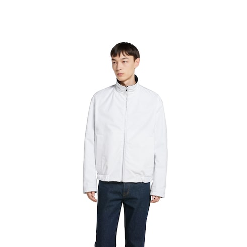 Idéales pour le bord de mer, les créations d’inspiration marine rehaussent les silhouettes décontractées de rayures, de motifs ancre et du logo de la Maison au sein de la collection Pre-Fall 2025. Cette veste zippée est confectionnée en gabardine de coton GG bleu foncé d’un côté et en gabardine de coton blanche de l’autre.