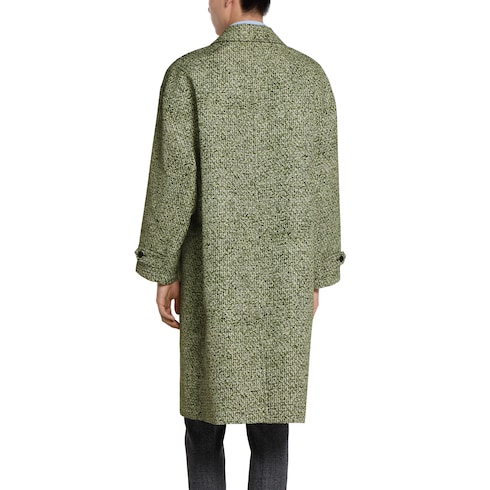 Pour la collection Automne-Hiver 2025, la silhouette se distingue par des lignes épurées et élégantes, sublimées par des étoffes raffinées et des clins d’œil à la conception vestimentaire britannique classique. Ce manteau long se distingue par sa conception sans doublure et son volume structuré, sublimé par des plis pressés sur les manches et des détails brandebourgs aux poignets.