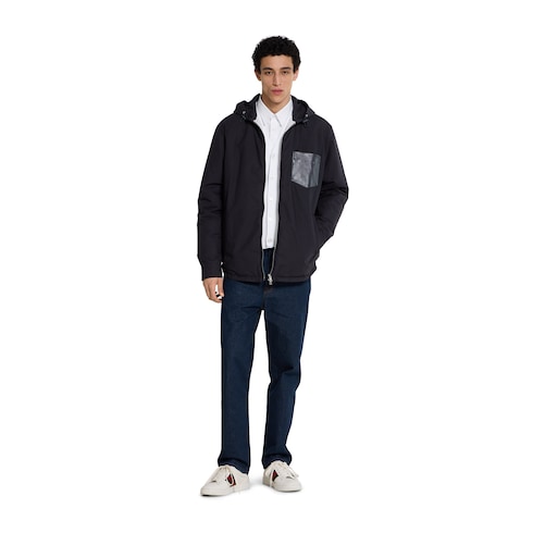 La collection Pre-Fall 2025 associe à la perfection textures variées et détails sophistiqués. Confectionnée en popeline de coton bleu foncé, cette veste matelassée révèle un logo Gucci embossé sur la poche poitrine en cuir.