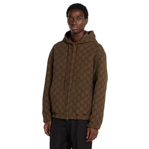 La collection Pre-Fall 2025 associe à la perfection textures variées et détails sophistiqués. Le tissage en jacquard et les broderies raffinées évoluent au fil des saisons. Cette veste légèrement matelassée est confectionnée dans un tissu bouclé GG marron.