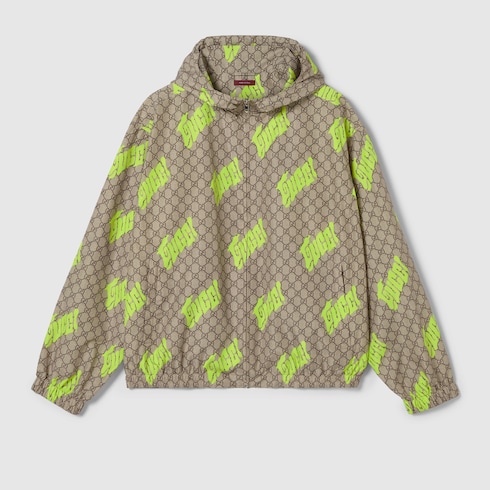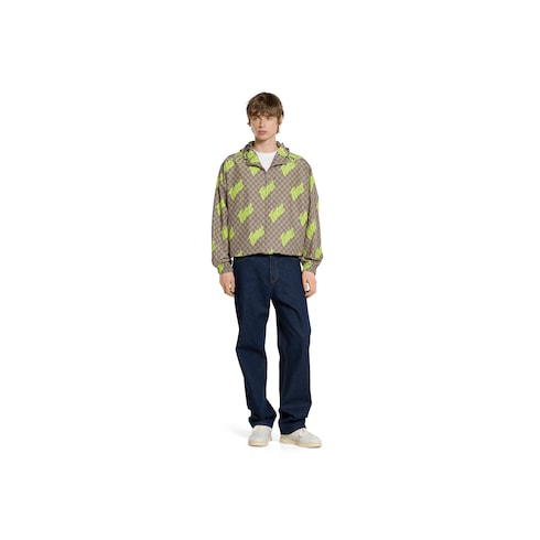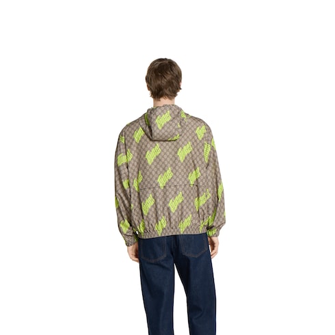 Pour la collection Pre-Fall 2025, l’artiste chinois Currynew (Xiang Zhang) revisite le logo de la Maison sur des pièces de prêt-à-porter, des articles de maroquinerie et des accessoires pour homme. Confectionnée en popeline de polyester technique beige, marron foncé et vert clair, cette veste zippée est ornée d’un imprimé GG et Gucci sur toute la surface.
