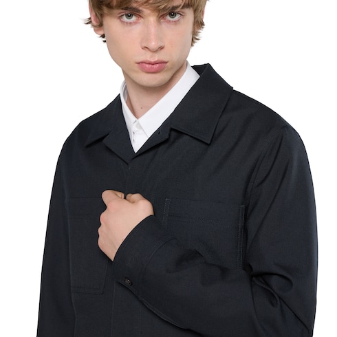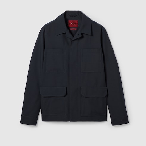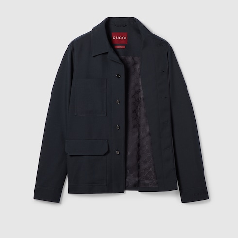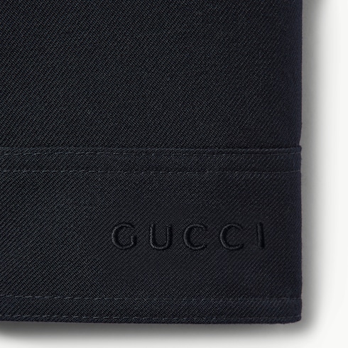 La collection Pre-Fall 2025 associe à la perfection textures variées et détails sophistiqués. Le tissage en jacquard et les broderies raffinées évoluent au fil des saisons. Confectionnée en serge de laine bleu foncé, cette veste est rehaussée d’un logo Gucci brodé.
