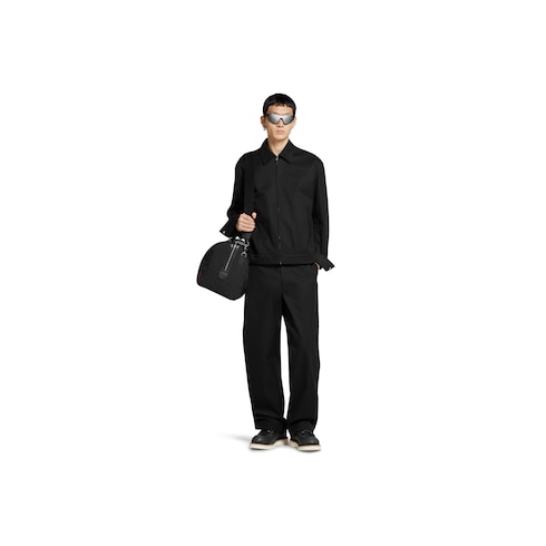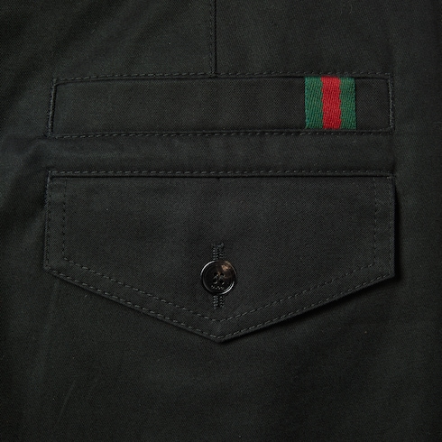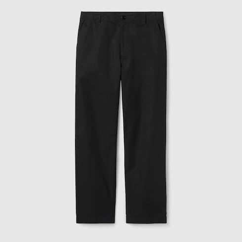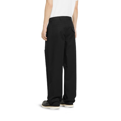 La collection Pre-Fall 2025 présente de nouvelles silhouettes dans des matériaux raffinés. Confectionné en twill de coton noir, ce pantalon est rehaussé d’un détail bande Web vert et rouge à l’arrière.