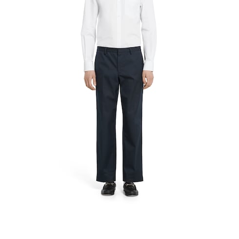 La collection Pre-Fall 2025 associe à la perfection textures variées et détails sophistiqués. Ce pantalon confectionné en twill de coton bleu foncé est orné d’un détail bande Web sur les poches.