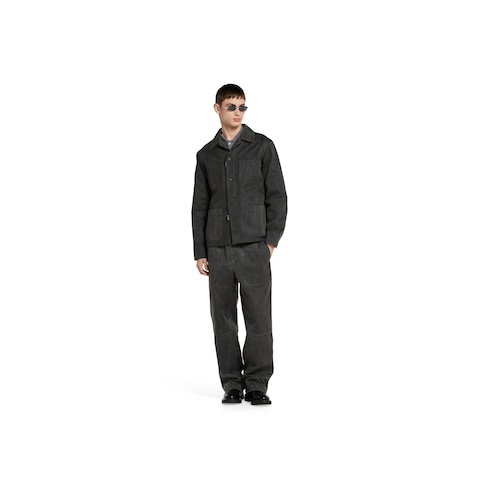 Les pièces de la collection Pre-Fall 2025 présentées dans des tons noir, gris et vert discrets mettent en valeur de délicates broderies fleuries, des logos en relief et d’autres détails soignés. Confectionné en toile de coton délavé coloris noir et gris, ce pantalon est orné d’un logo Gucci en relief.