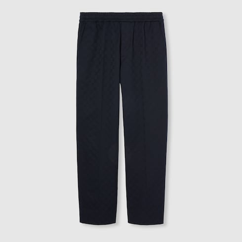 Inspiré du monogramme du fondateur Guccio Gucci, le motif GG reste l’un des motifs incontournables de la Maison. Ce pantalon droit est présenté en gabardine de coton GG bleu foncé. Une taille élastique avec cordon coulissant complète sa silhouette.