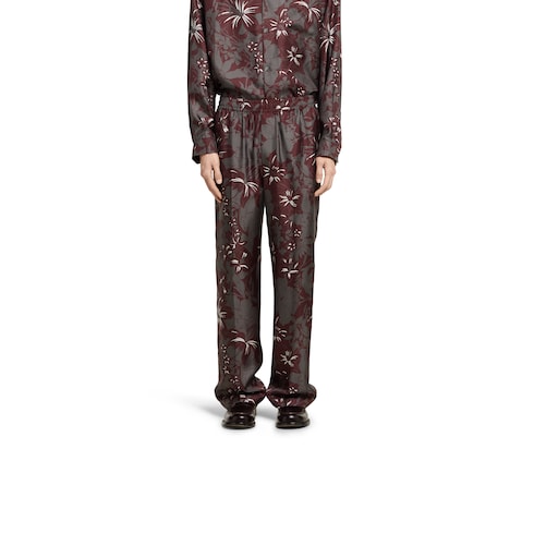 Dans la collection Pre-Fall 2025, une sélection de pièces de prêt-à-porter se caractérise par un esprit bohème coloré et des silhouettes décontractées. Confectionné en twill de soie gris foncé et marron, ce pantalon arbore un imprimé fleuri sur toute la surface associé au logo Gucci.