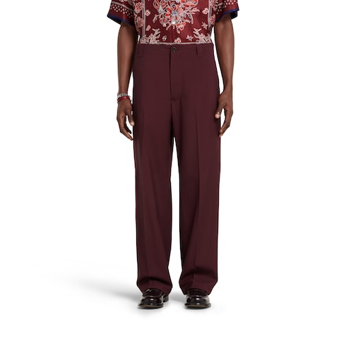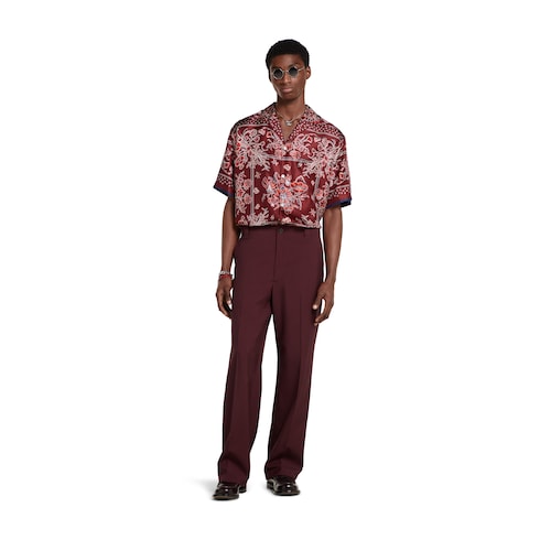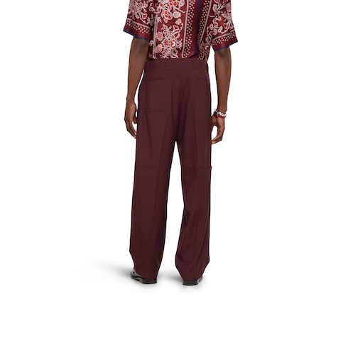 Pour la collection Pre-Fall 2025, une approche décontractée des tenues habillées voit l’arrivée de nouvelles silhouettes et coupes. Des éléments signature sont associés à des détails raffinés. Confectionné en gabardine de laine bordeaux, ce pantalon se caractérise par une broderie Gucci.