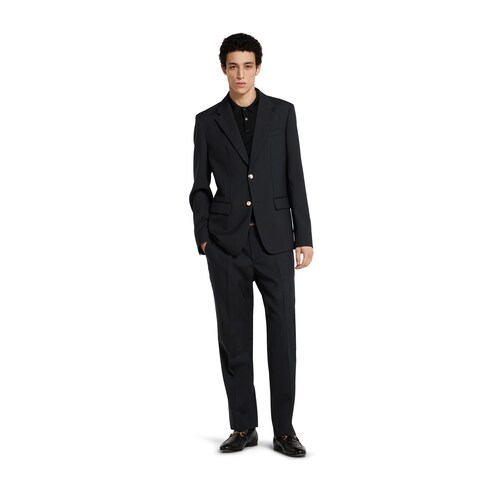 Les pièces du quotidien sont rehaussées du liseré Gucci ou de l’imprimé logo vintage Gucci pour une allure urbaine. Confectionné en laine coloris bleu foncé, ce pantalon se caractérise par un liseré Gucci rouge à la taille, ajoutant une touche sophistiquée.