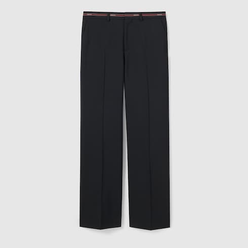 Les pièces du quotidien sont rehaussées de la lisière Gucci ou de l’imprimé logo vintage Gucci pour une allure urbaine. Ce pantalon en laine bleu foncé est orné d’un détail lisière Gucci à la taille.