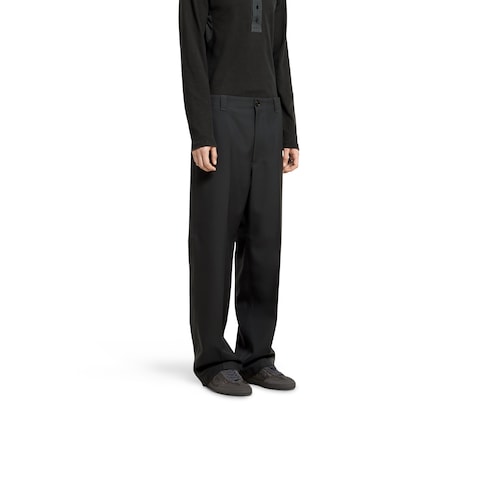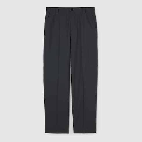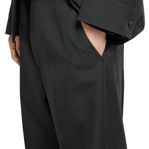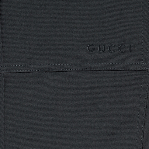 Pour la collection Pre-Fall 2025, une approche décontractée des tenues habillées voit l’arrivée de nouvelles silhouettes et coupes. Des éléments signature sont associés à des détails raffinés. Confectionné en twill de laine gris foncé, ce pantalon se caractérise par une broderie Gucci.