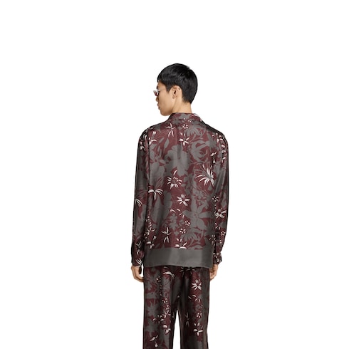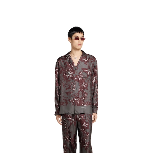 Dans la collection Pre-Fall 2025, une sélection de pièces de prêt-à-porter se caractérise par un esprit bohème coloré et des silhouettes décontractées. Confectionnée en twill de soie gris foncé et marron, cette chemise arbore un imprimé fleuri sur toute la surface associé au logo Gucci.