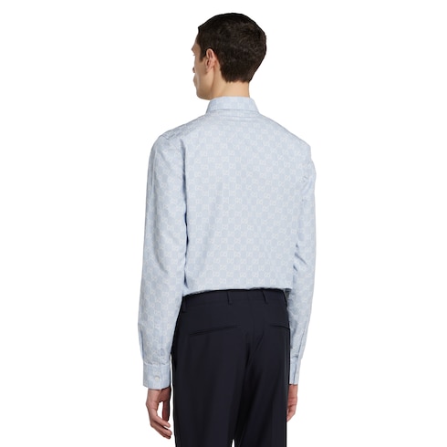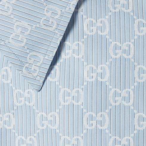 Pour la collection Pre-Fall 2025, les modèles habillés inspirés de l’univers des loisirs introduisent de nouvelles silhouettes et coupes. Les éléments emblématiques sont associés à des détails raffinés. Cette chemise est confectionnée en jacquard de coton GG rayé bleu clair.