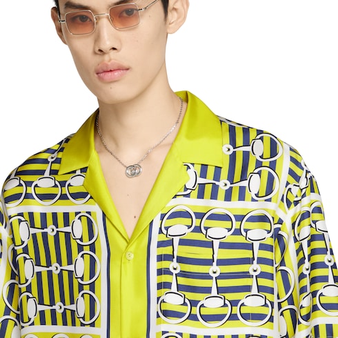 La collection Pre-Fall 2025 apporte une touche de raffinement à votre garde-robe de tous les jours avec un mélange de textures, de motifs et de couleur, que ce soit sur les pièces en soie arborant l’imprimé Mors ou les chemises en maille crochet. Cette chemise coupe standard est confectionnée dans un twill de soie vert clair et bleu avec un imprimé Mors à rayures sur toute la surface rendant hommage à l’héritage équestre de la Maison.