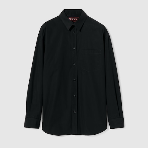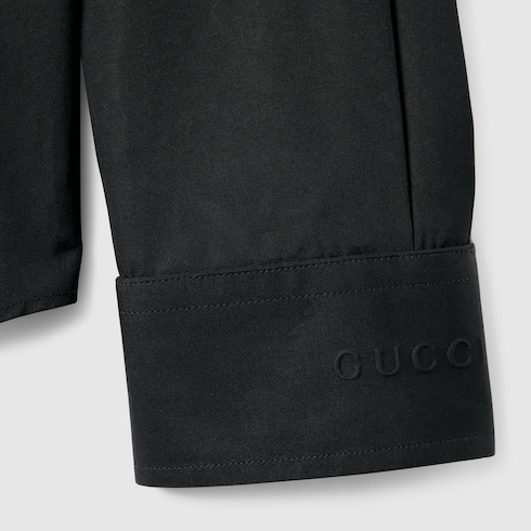 La collection Pre-Fall 2025 associe à la perfection textures variées et détails sophistiqués. Confectionnée en popeline de coton épaisse noire, cette chemise se caractérise par un col et des poignets doubles et présente un logo Gucci en relief.