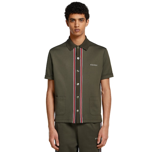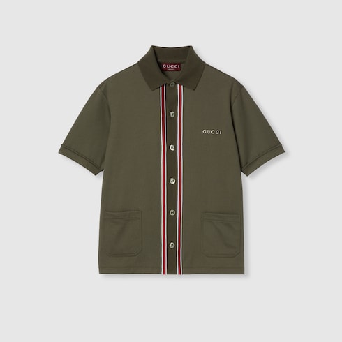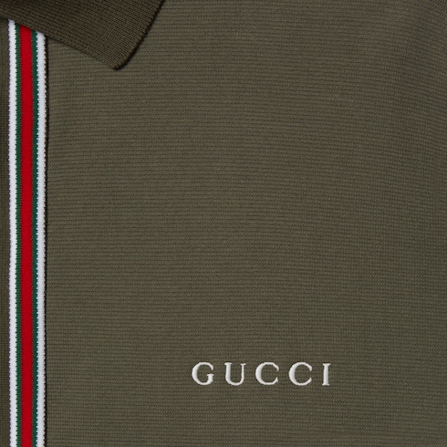 Les pièces de la collection Pre-Fall 2025 présentées dans des tons noir, gris et vert discrets mettent en valeur de délicates broderies fleuries, des logos en relief et d’autres détails soignés. Confectionné en piqué de coton stretch vert forêt, ce polo se caractérise par une broderie Gucci et des bandes Web verticales.