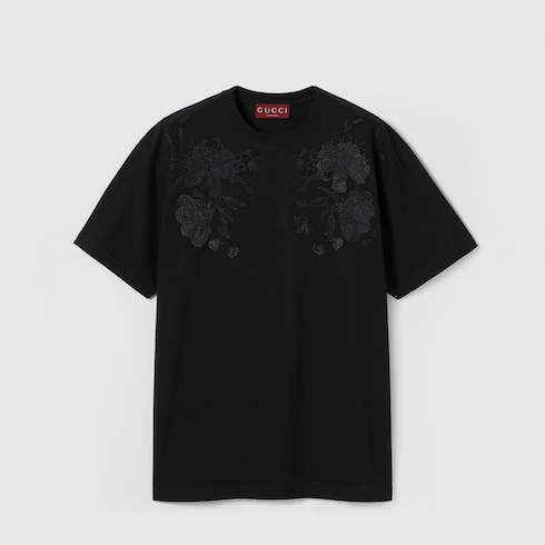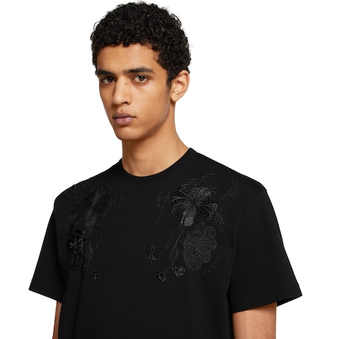 Les pièces de la collection Pre-Fall 2025 présentées dans des tons noir, gris et vert discrets mettent en valeur de délicates broderies fleuries, des logos en relief et d’autres détails soignés. Ce t-shirt coupe regular en jersey de coton noir est orné d’une broderie fleur Gucci.