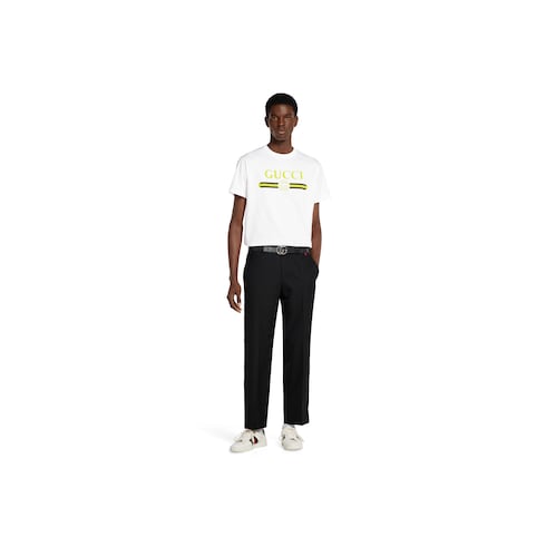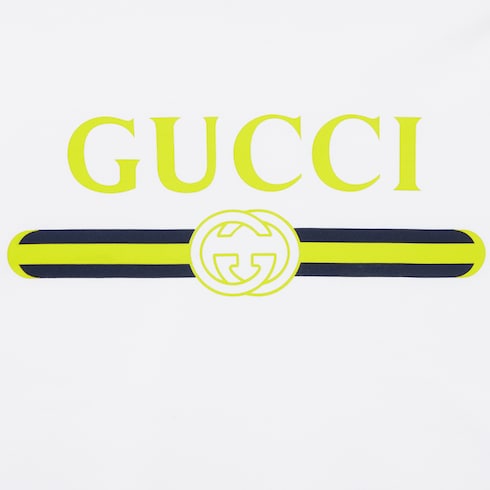 Les pièces du quotidien sont rehaussées du liseré Gucci ou de l’imprimé logo vintage Gucci pour une allure urbaine. Confectionné en jersey de coton blanc, ce t-shirt est orné d’un logo Gucci avec imprimé à détail GG enlacés et bande Web.