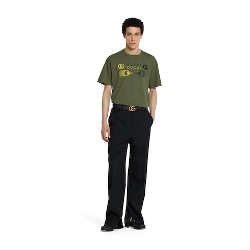 La collection Pre-Fall 2025 apporte une touche de raffinement à votre garde-robe de tous les jours avec un mélange de textures, de motifs et de couleur, que ce soit sur les pièces en soie arborant l’imprimé Mors ou les chemises en maille crochet. Ce t-shirt coupe regular en jersey de coton vert forêt est orné d’un imprimé Mors et Double G.