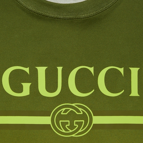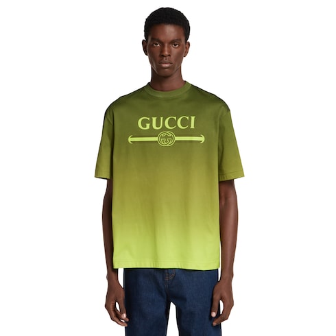 Le dégradé de couleurs est réalisé avec soin pour mettre en valeur la texture des matériaux et le motif GG emblématique. Confectionné en jersey de coton technique avec dégradé de vert, ce t-shirt est orné d’un logo Gucci avec imprimé à détail GG enlacés.