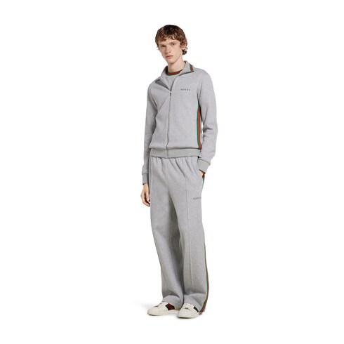Une sélection de pièces de prêt-à-porter est rehaussée de détails emblématiques de la Maison. Confectionné dans un piqué de coton double gris mélangé, ce pantalon est agrémenté d’une bande Web emblématique et d’un logo brodé.