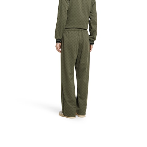 Les pièces de la collection Pre-Fall 2025 présentées dans des tons noir, gris et vert discrets mettent en valeur de délicates broderies fleuries, des logos en relief et d’autres détails soignés. Confectionné en jacquard GG en jersey, ce pantalon large est agrémenté d’un passepoil raffiné et d’une taille élastique confortable.