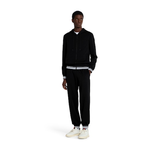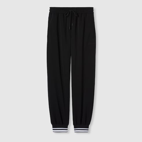 La collection Pre-Fall 2025 met en avant des silhouettes incontournables avec des détails emblématiques, pour la journée comme la soirée. Ce pantalon de sport décontracté en jersey technique noir est orné d’un logo Gucci en relief.