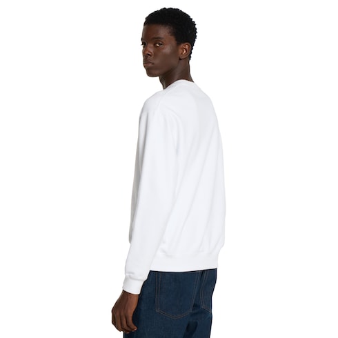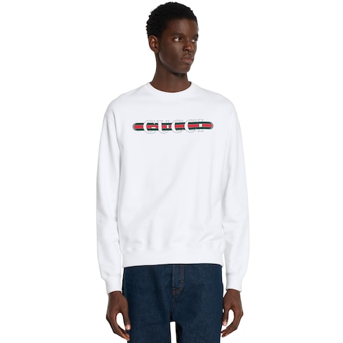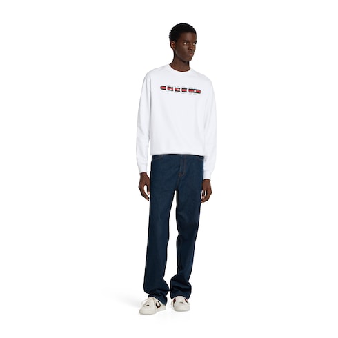 Les codes de la Maison évoluent encore pour la nouvelle saison sur les pièces en jersey. Confectionné en jersey de coton blanc, ce sweat-shirt à la coupe regular est rehaussé d’un imprimé bande Web Gucci.