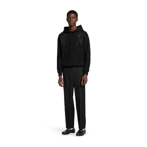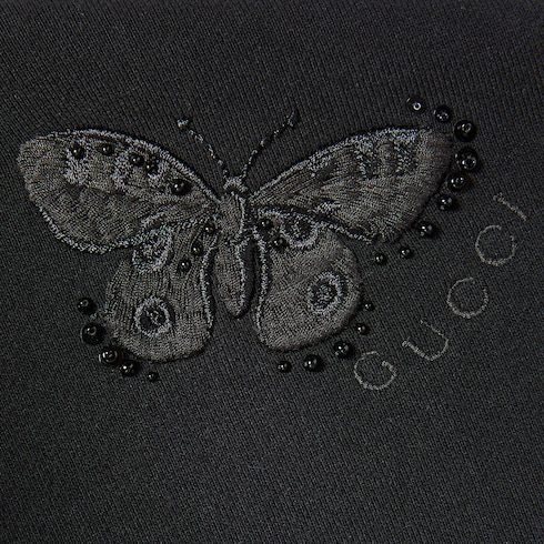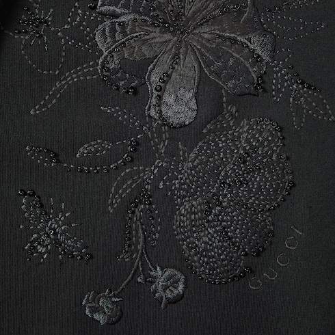 Les pièces de la collection Pre-Fall 2025 présentées dans des tons noir, gris et vert discrets mettent en valeur de délicates broderies fleuries, des logos en relief et d’autres détails soignés. Réalisé en jersey de coton noir, ce sweat-shirt est orné d’une broderie fleur Gucci.