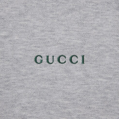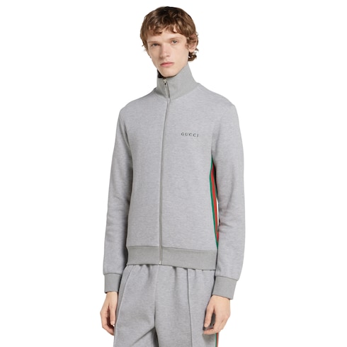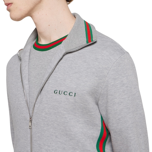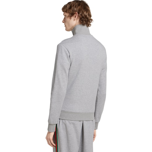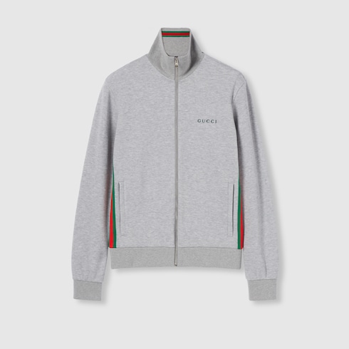 Une sélection de pièces de prêt-à-porter est rehaussée de détails emblématiques de la Maison. Confectionnée dans un piqué de coton double gris mélangé, cette veste zippée est agrémentée d’une bande Web emblématique et d’un logo brodé.