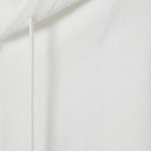 Idéales pour le bord de mer, les créations d’inspiration marine rehaussent les silhouettes décontractées de rayures, de motifs ancre et du logo de la Maison au sein de la collection Pre-Fall 2025. Cette veste zippée est confectionnée en jersey technique GG en relief blanc.