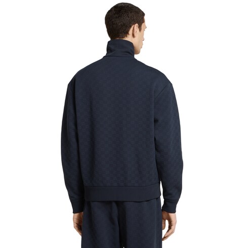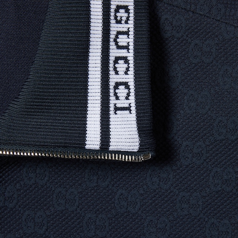 Une sélection de pièces de prêt-à-porter est rehaussée de détails emblématiques de la Maison. Confectionnée en jersey technique bleu marine, cette veste zippée se caractérise par un motif GG embossé sur toute la surface.