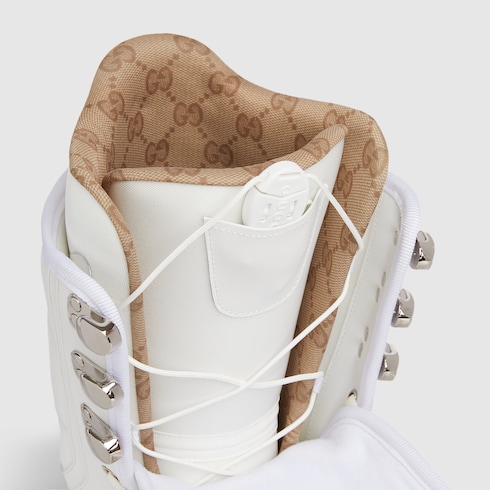 Gucci altitude, la première collection de vêtements de sport d’hiver de la Maison, associe performances avancées et codes signature. Cette chaussure pour homme arbore les codes audacieux de la Maison. La bande Web vert et rouge apparaît sur la languette et les détails, apportant une touche unique à cette silhouette pensée pour les performances.
