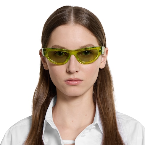 La collection de lunettes Pre-Fall 2025 présente le motif Guccissima dans une teinte et une silhouette audacieuses. Ces lunettes de soleil à monture œil-de-chat sont confectionnées en acétate avec un motif GG sur toute la surface. Le modèle est rehaussé de verres de coloris vert uni.
